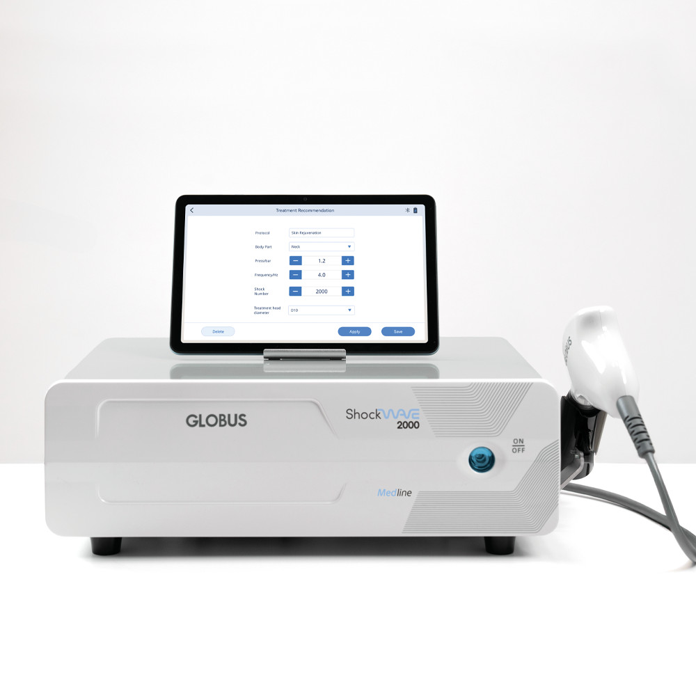 A ShockWAVE 2000 Med Line a Globus orvosi radialis lökéshullám készüléke: nagy energiájú akusztikus impulzusokkal aktiválja a szervezet természetes regenerációs folyamatait, kifejezetten myofasciális és mozgásszervi fájdalomszindrómák célzott kezeléséhez. A rendszer tabletes érintőképernyős felülettel, a kézidarabon integrált kijelzővel és valós idejű nyomásjelzéssel dolgozik, így a beállítás és a kontroll gyors és egyértelmű a rendelői rutinban.